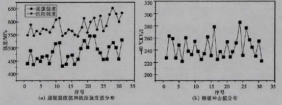 圖2:正火態(tài)Q370qE鋼板屈服強(qiáng)度值、抗拉強(qiáng)度值和沖擊功值的分布