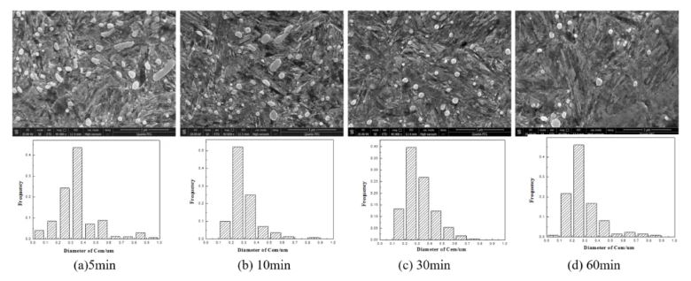 基于已有技術(shù)成果理論,定量表征保溫過(guò)程中相組成的演變規(guī)律。研究表明,同一溫度下,隨保溫時(shí)間的延長(zhǎng),碳化物比例逐漸降低,且尺寸小的碳化物出現(xiàn)的頻率越來(lái)越高;同一保溫時(shí)間下,加熱溫度越高,碳化物體積及粒子尺寸越。▓D6)。