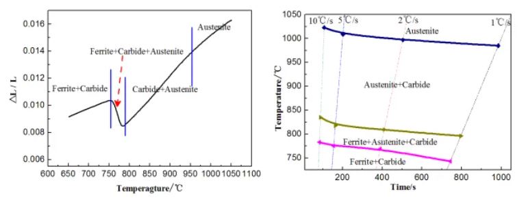 圖 4 加熱奧氏體化過(guò)程膨脹曲線、TTA曲線