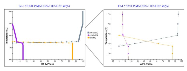 運(yùn)用J-Mat pro熱力學(xué)軟件,繪制出軸承鋼的相圖。溫度升高至750℃時(shí),基體開(kāi)始發(fā)生奧氏體化,溶碳能力驟增,碳化物開(kāi)始溶解(圖2)。