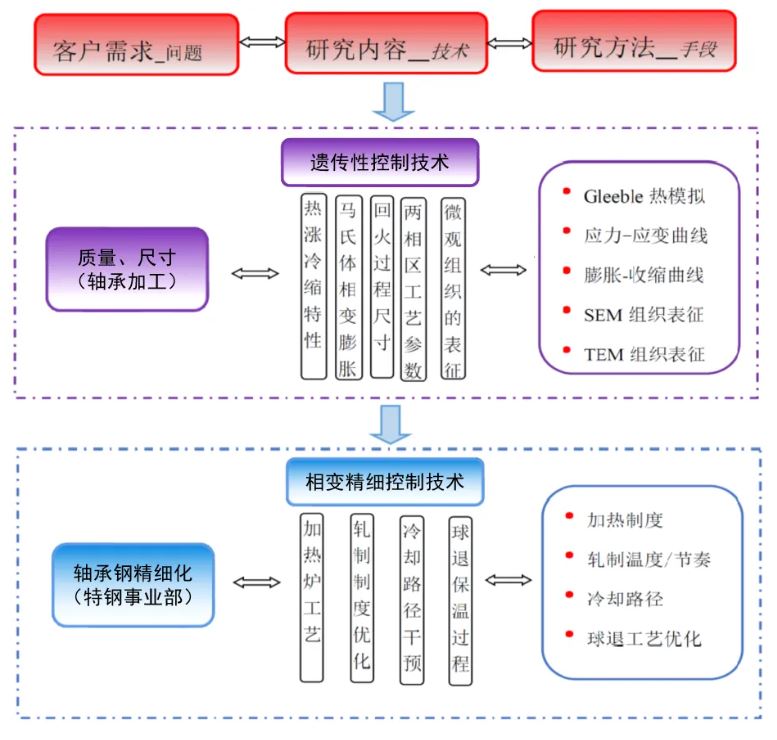 基于用戶對(duì)軸承(鋼)產(chǎn)品加工過(guò)程尺寸穩(wěn)定性、尺寸精度和疲勞性能的綜合要求,從全流程角度對(duì)基體組織、殘余奧氏體和碳化物進(jìn)行精確定量控制,揭示其組織遺傳性規(guī)律,實(shí)現(xiàn)殘余奧氏體穩(wěn)定性提升及組織遺傳性的定量控制,明確加工過(guò)程微觀相演變(包括球狀碳化物、殘余奧氏體含量與狀態(tài)等)與尺寸穩(wěn)定性和疲勞壽命的關(guān)系,提出工藝改進(jìn)和調(diào)控方向,為工業(yè)化穩(wěn)定生產(chǎn)和質(zhì)量提升提供精確的工藝參數(shù)指導(dǎo),實(shí)現(xiàn)全生產(chǎn)鏈微觀相構(gòu)成和演變的定性/定量控制,促進(jìn)高品質(zhì)、高尺寸穩(wěn)定性、高疲勞壽命軸承產(chǎn)品的研發(fā)及產(chǎn)業(yè)化。