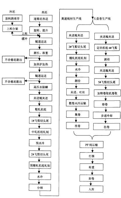 鄂鋼合金型材廠生產線于2002年初開始設計,2002年10月28日破土動工,2003年12月26日竣工投產,歷時14個月。該工程總投資約2.5億元,年設計產量50萬t,坯料尺寸為:150mm×150mm×9000mm,200mm×200mm×9000mm,240mm×240mm×9000mm,最高設計軋制速度18m/s。產品規(guī)格為Φ20mm-Φ130mm圓鋼,Φ20mm-Φ50mm螺蚊鋼,厚度60 -120mm,寬度60 -120mm的彈簧扁鋼。生產的鋼種以優(yōu)質合金鋼為主,如20Cr,40Cr,20CrMoTi,35CrMo,42MnMo及60Si2Mn等;其它普碳、優(yōu)碳、低合金為輔,如Q195-Q235,45#-60#碳結鋼等;合金鋼比要大于50%。產品質量全部適用于公司內控標準(內控標準嚴于國家標準)。