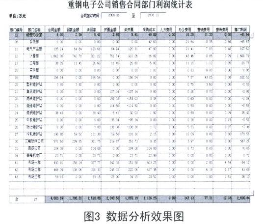 重鋼電子企業(yè)經(jīng)營(yíng)管理控制系統(tǒng)將重鋼電子的經(jīng)營(yíng)管理過(guò)程中各項(xiàng)收支數(shù)據(jù)整合到一起,并運(yùn)用良好的數(shù)據(jù)分析方法將企業(yè)各方面的運(yùn)營(yíng)指標(biāo)明細(xì)化。企業(yè)相關(guān)管理人員可以通過(guò)系統(tǒng)快速、準(zhǔn)確地了解企業(yè)當(dāng)前的各個(gè)銷售業(yè)務(wù)合同以及各個(gè)方面的實(shí)時(shí)數(shù)據(jù)情況,并能詳細(xì)分析各個(gè)方面的細(xì)節(jié),擺脫了以往不能明細(xì)說(shuō)明各個(gè)盈虧數(shù)據(jù)細(xì)節(jié)的狀況,能方便快捷的提供了解日常經(jīng)營(yíng)的實(shí)際情況的數(shù)據(jù),為領(lǐng)導(dǎo)層提供實(shí)時(shí)準(zhǔn)確的決策依據(jù)。同時(shí)采用的數(shù)據(jù)挖掘方法解決了單單解決企業(yè)整合數(shù)據(jù)的局限,在解決整合數(shù)據(jù)的基礎(chǔ)上,能夠?qū)?shù)據(jù)進(jìn)行統(tǒng)計(jì)分析,建立企業(yè)各方面的數(shù)據(jù)指標(biāo)報(bào)表,如圖3所示。
